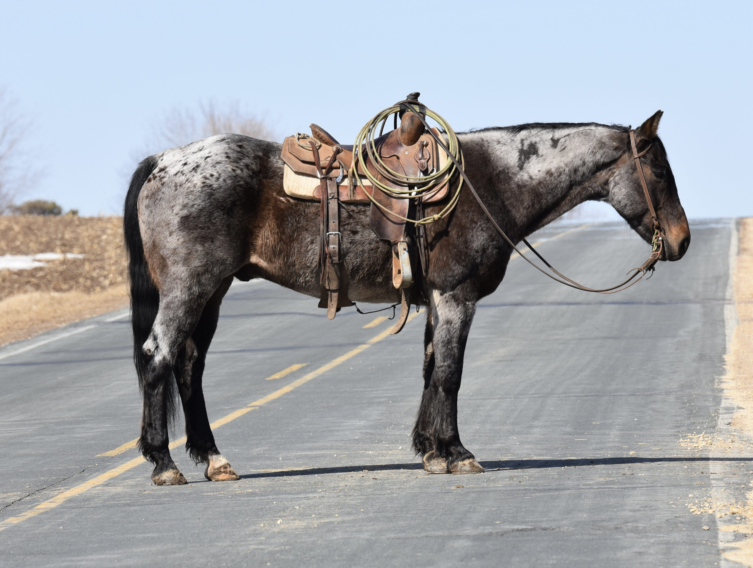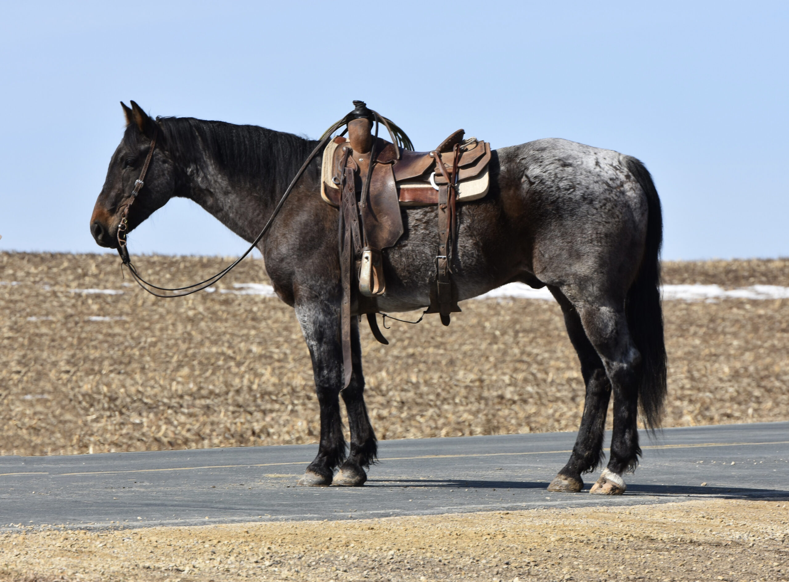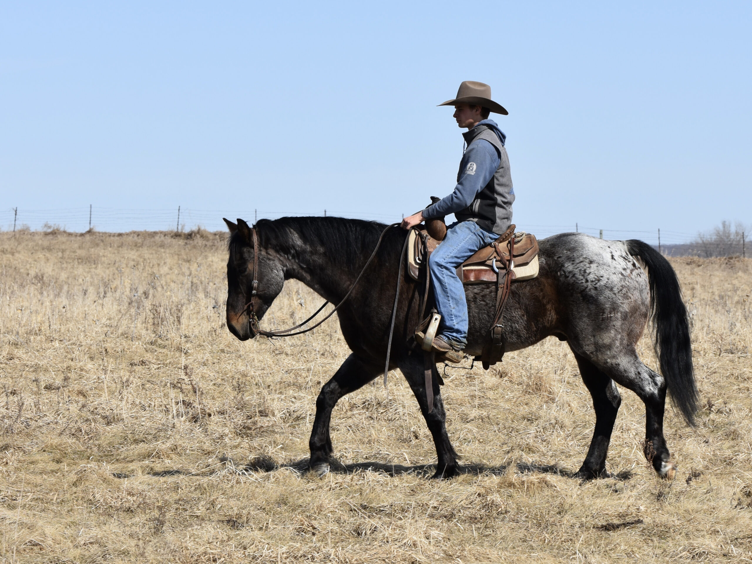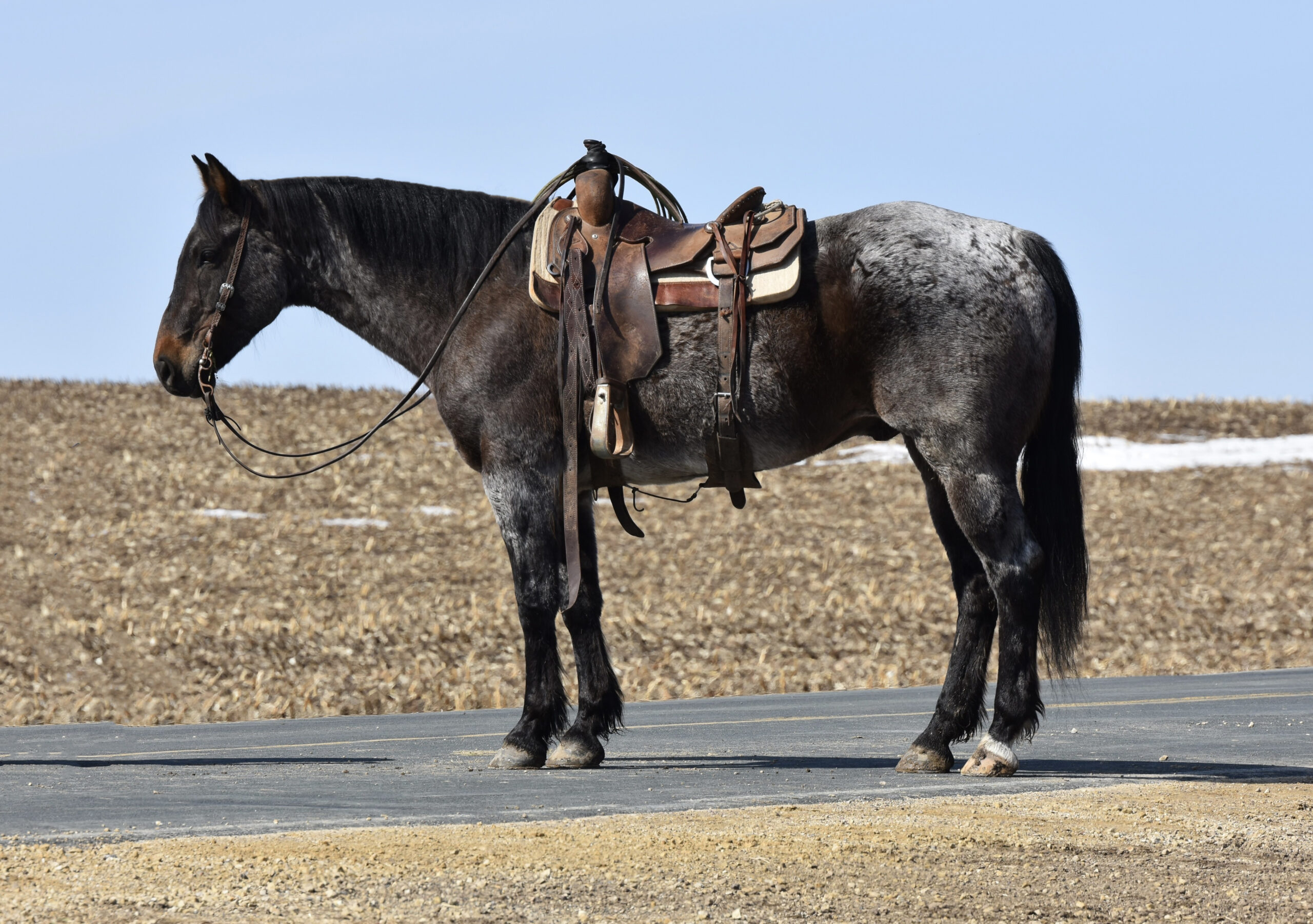 He rides inside the arena, out in the field, or down the road. We have put him through our wringer: cats, dogs, machinery, tarps, balls, cattle, and traffic. He has that look that everyone wants to have on their ranch and then turn around and sell for the big times.